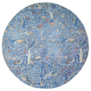 10'4"x10'4" Ruddy Blue, Hand Knotted, Organic Wool, Afghan Peshawar With Birds Of Paradise, Vegetable Dyes, Round, Oriental Rug FWR528558