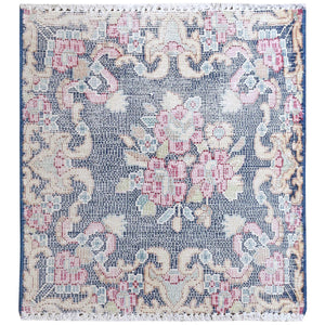 1'7"x1'7" Indigo Blue, Hand Knotted, Vintage And Worn Persian Kerman With Leaf And Bird Design, Cropped Thin, Distressed, Pure Wool, Square, Oriental Rug FWR468738