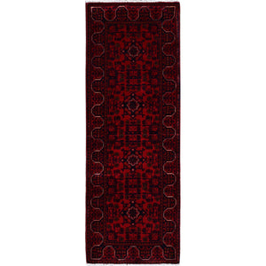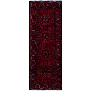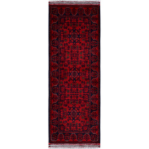 1'8"x4'9" Carmine Red, Afghan Khamyab With Geometric Pattern, Hand Knotted, Soft And Velvety Wool, Vegetable Dyes, Short And Narrow Runner, Oriental Rug FWR4542