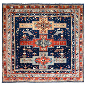 11'5"x11'9" Hague Blue And Matte Silver Gray, Hand Knotted Armenian Inspired Caucasian Design With Small Birds Figurines 200 Kpsi, Natural Dyes, Densely Woven, Soft Wool Square Oriental Rug FWR518454