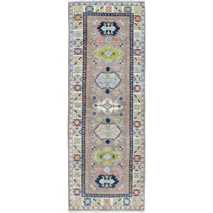 2'1"x5'10" Frost Gray, Kazak With Tribal Medallions Design, Soft And Velvety Wool, Hand Knotted, Denser Weave, Vegetable Dyes, Narrow Runner, Oriental Rug FWR2934