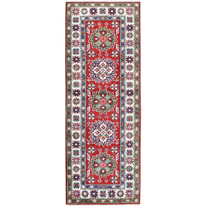 2'1"x6' Crimson Red, Kazak With Tribal Medallions Design, Hand Knotted, Vegetable Dyes, Soft And Shiny Wool, Denser Weave, Narrow Runner, Oriental Rug FWR2964