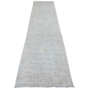 2'10"x11'5" Pearl White, Afghan Angora Oushak With Muted Colors Leaf Pattern, Vegetable Dyes, Hand Knotted, 100% Wool, Runner, Oriental Rug FWR123504