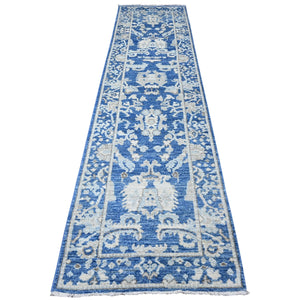 2'10"x11'9" Imperial Blue, Hand Knotted, Afghan Angora Oushak, Natural Dyes, Wool Foundation With Tribal Flower Design, Runner Oriental Rug FWR534120