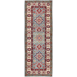 2'2"x6' Misty Gray, Kazak With Tribal Medallions Design, Soft And Velvety Wool, Hand Knotted, Denser Weave, Vegetable Dyes, Narrow Runner, Oriental Rug FWR2988