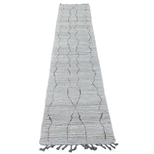 2'3"x10'5" Chiffon White, Moroccan Weave With Zigzag Line Design, Soft Wool, Hand Knotted, Textured Pile, Runner, Oriental Rug FWR121650