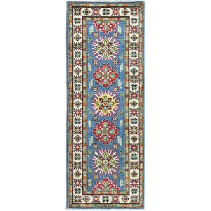 2'3"x6' Carolina Blue, Kazak With Tribal Medallions Design, Hand Knotted, Soft And Velvety Wool, Denser Weave, Vegetable Dyes, Narrow Runner, Oriental Rug FWR2928