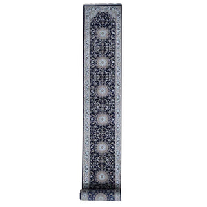 • 3'x18' Midnight Blue Pure Wool 250 Kpsi Nain With Flower Medallion Design Xl Runner Hand Knotted Oriental Rug FWR397368