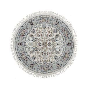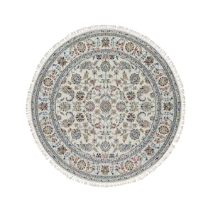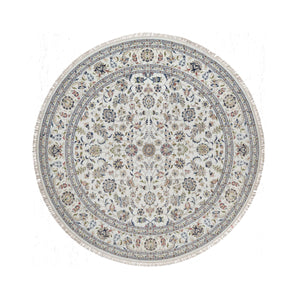 6'x6' Alabaster White, Hand Knotted, Nain With All Over Flower Pattern, Wool And Silk, Soft Pile, 250 Kpsi, Round, Oriental Rug FWR549372