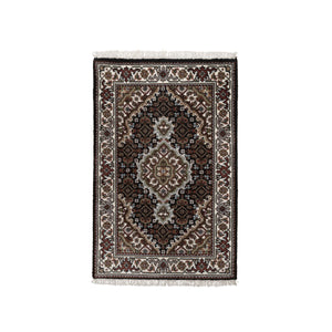2'x3' Jet Black, Tabriz Mahi With Fish Medallion Design, 175 Kpsi, 100% Wool, Hand Knotted, Sample, Mat, Oriental Rug FWR549402