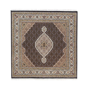 6'1"x6'1" Tabriz Mahi Fish Medallion Design Black Hand Knotted Wool Oriental Square Rug FWR375300