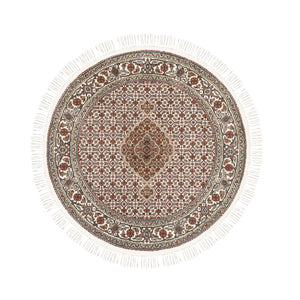 4'x4' Hand Knotted Ivory Wool Fish Medallion Design Tabriz Mahi Oriental Round Rug FWR375546