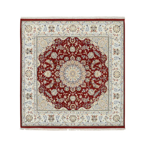 6'x6' Cherry Red, Nain With Center Medallion Flower Design 250 Kpsi, Pure Wool Hand Knotted, Square Oriental Rug FWR388344