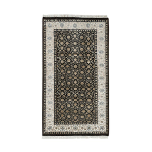 2'5"x4'7" Eerie Black, Hand Knotted Herati With All Over Fish Mahi Design, 250 Kpsi Densely Woven, Pure Wool, Oriental Rug FWR391860