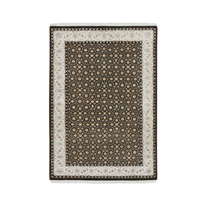 4'1"x6' Eerie Black, Hand Knotted Herati With All Over Fish Mahi Design, 250 Kpsi Densely Woven, 100% Wool, Oriental Rug FWR392088