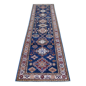 2'6"x11' Hand Knotted Navy Blue Afghan Super Kazak With Bold Colors Soft And Pliable Wool Oriental Runner Rug FWR368736