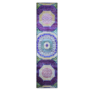 2'6"x10'4" Colorful Sari Silk With Textured Wool Mamluk Design Hand Knotted Runner Oriental Rug FWR398976