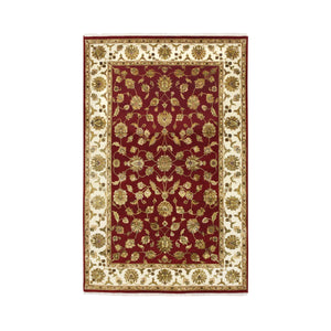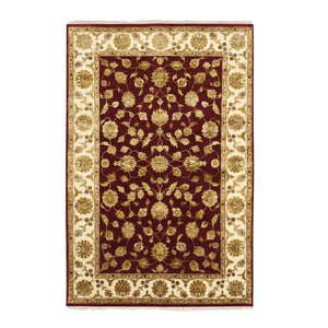 6'x9' Crimson Red, Hand Knotted, Wool And Silk, Soft Pile, Rajasthan With All Over Leaf Design, Thick And Plush, Oriental Rug FWR453624