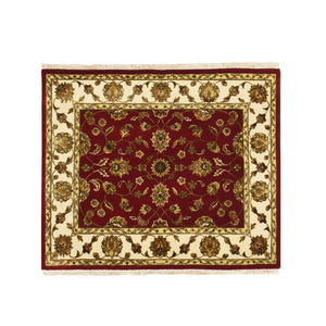 4'2"x5' Carmine Red, Rajasthan With All Over Leaf Design, Hand Knotted, Wool And Silk, Soft Pile, Thick And Plush, Squarish, Oriental Rug FWR453630