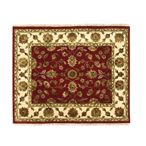 4'1"x5' Currant Red, Hand Knotted, Wool And Silk, Soft Pile, Thick And Plush, Rajasthan With All Over Leaf Design, Squarish, Oriental Rug FWR453636