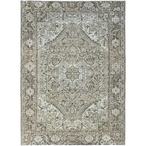 7'1"x9'8" Beige, Vintage And Worn, Persian Heriz With Geometric Medallion Design, Shaved Down, Sides And Ends Professionally Secured, Clean, Hand Knotted, 100% Wool, Oriental Rug FWR7986