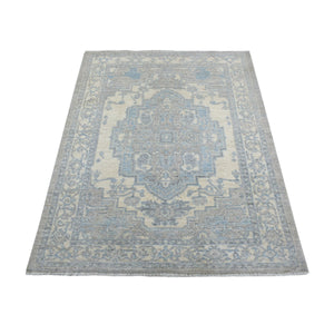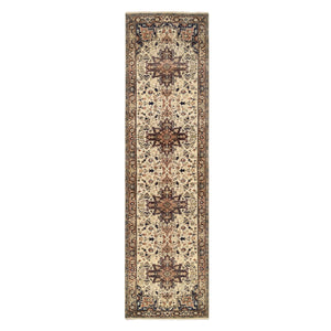 2'7"x10'3" Beige Antiqued Heriz Re-creation With Geometric Medallions Extra Soft Wool Hand Knotted Oriental Runner Rug FWR381528