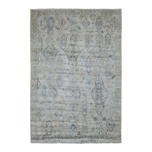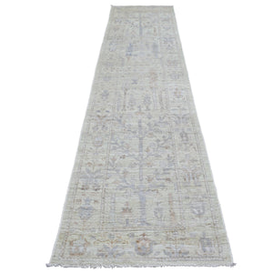 2'8"x11'9" Extra Soft Wool Hand Knotted Silver Angora Oushak With Faded Out Cypress And Willow Tree Design Oriental Runner Rug FWR419358