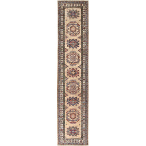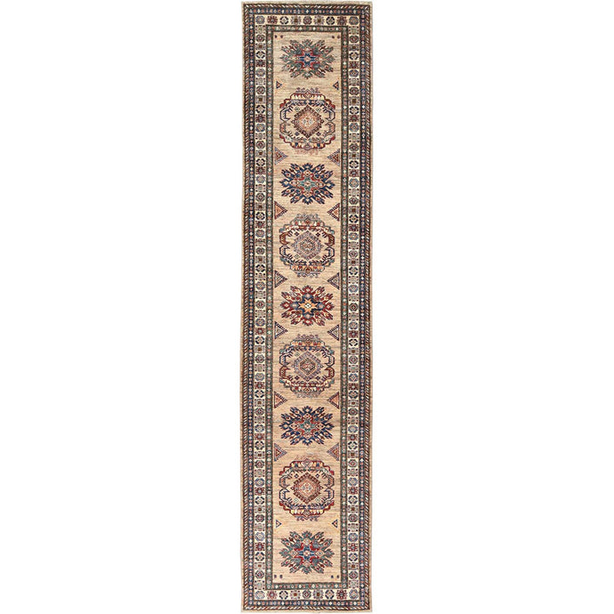3'x13'6" Tortilla Brown, Hand Knotted Afghan Super Kazak With Geometric Medallions Design, Natural Dyes Dense Weave, Extra Soft Wool, Runner Oriental Rug FWR497466