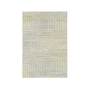 4'x6' Tan Brown With Gray, Mid Century Inspired Grid And Line Design, Modern, Wool & Pure Silk, Hand Knotted Oriental Rug FWR453012