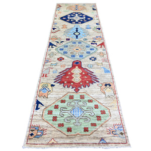3'x10' Tan Color, Anatolian Village Inspired With Large Design Elements And Bird Figurines Pure Wool Hand Knotted Oriental Runner Rug FWR445344