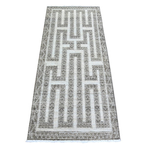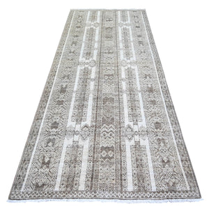 4'x11'8" Taupe Brown, Hand Knotted Extra Soft Wool, Natural Dyes Fine Peshawar With Intricate Geometric Motifs Maze Design, Runner Oriental Rug FWR445596