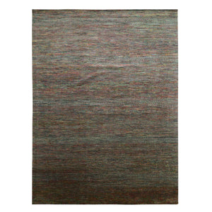 9'1"x12'2" Dark Olive Green, Wool And Silk, Modern Grass Design, Hand Knotted, Tone On Tone, Lush And Plush, Oriental Rug FWR499434