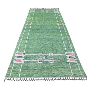 2'6"x9'1" Fern Green, Moroccan Weave With Flying Kite Design, Geometric Pattern, Hand Knotted, Soft Wool, Tone On Tone, Textured Pile, Runner, Oriental Rug FWR124482