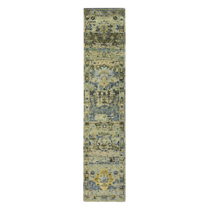 2'6"x12'4" Laurel Green, Broken And Erased Persian Inspired With Birds Design, Hand Knotted, Distinct Abrash, Shaved Low, 100% Wool, Runner, Oriental Rug FWR454122
