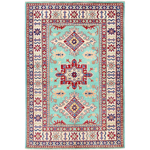 4'x5'10" Aqua Green, Kazak With Tribal Medallions Design, Vegetable Dyes, Denser Weave, Soft And Vibrant Wool, Hand Knotted, Oriental Rug FWR2130