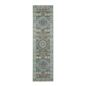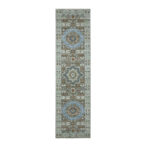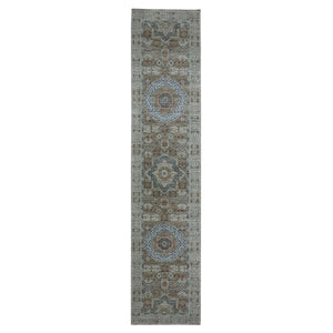 2'7"x12'1" Sage Green, Pre Historic 14th Century Influence, Mamluk Design, Natural Dyes, Hand Knotted, Pure Wool, Runner, Oriental Rug FWR460884