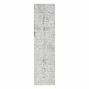 4'1"x12' Light Gray Hand Spun Undyed Natural Wool Modern Criss Cross Erased Design Hand Knotted Wide Runner Oriental Rug FWR384936