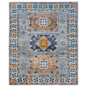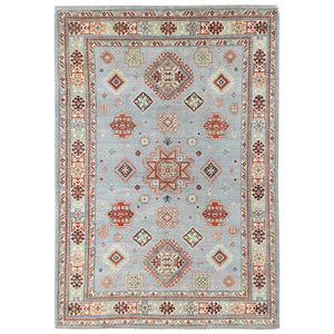 6'2"x8'9" Gray Special Kazak With Geometric Medallion Design, Hand Knotted, Organic Wool, Natural Dyes Oriental Rug FWR490530