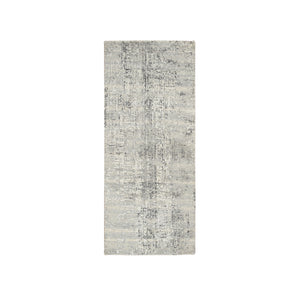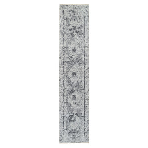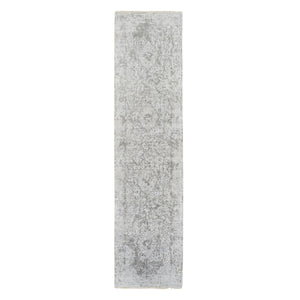 2'7"x12' Silver Gray, Wool And Silk Hand Knotted, Erased Persian Design, Runner Oriental Rug FWR389022