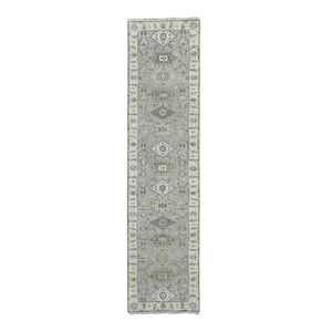 2'7"x11'10" Rhino Gray With White Dove, Hand Knotted, Extra Soft Wool, Karajeh Design With Geometric Medallion, Runner Oriental Rug FWR507138
