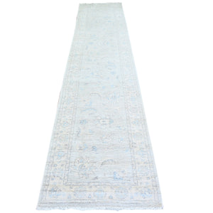 2'8"x12'2" Ice Gray, Vegetable Dyes, Peshawar Washed Out Faded Designs, Organic Wool, Hand Knotted, Runner Oriental Rug FWR448668