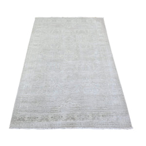 3'9"x6' Gainsboro And Glaucous Gray, Shiny Wool, Vegetable Dyes, Hand Knotted, White Wash Peshawar With Faded Design, Oriental Rug FWR446778