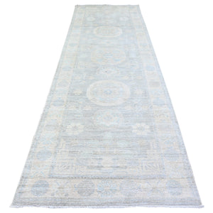 4'x12'1" Chrome Gray, White Wash Khotan With Pomegranate Garden Design, Organic Wool, Runner Oriental Rug FWR449262