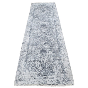 2'6"x10' Cadet Gray, Silk With Textured Wool, Hand Knotted, Erased And Broken Design, Runner Oriental Rug FWR523452