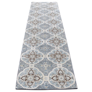 2'5"x10'1" Nickel Gray, Fine Jacquard Hand Loomed, Erased Design, Wool And Silk, Runner Oriental Rug FWR523626