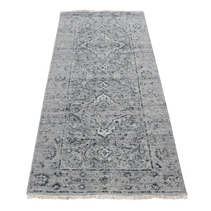 2'7"x7'10" Gainsboro Gray, Hand Knotted, Broken And Erased Persian Design, Wool And Pure Silk, Runner Oriental Rug FWR523746