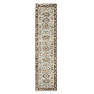 2'8"x12' Timberwolf Gray With Taupe Brown, Hand Knotted Karajeh And Geometric Medallion Design, Natural Dyes, Pure Wool, Runner Oriental Rug FWR508710