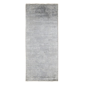 4'x9'8" Coin Gray, Broken And Erased Persian Design, Wide Runner, Wool And Silk, Hand Knotted Oriental Rug FWR526074