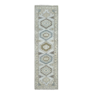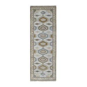 2'8"x10'1" Rhinestone Gray With Sand White, Geometric Motifs Persian Village, Hand Knotted, Densely Woven Organic Wool, Runner Oriental Rug FWR508806