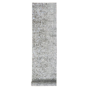 2'5"x10'1" Gray Fine Jacquard Hand Loomed Erased Design Wool And Silk Runner Oriental Rug FWR356160